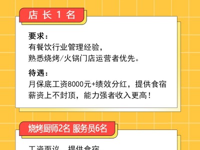 餐饮部招聘烧烤厨师 1名,炒菜师傅1名,服务员5名(年龄要求40以下)工资面议。