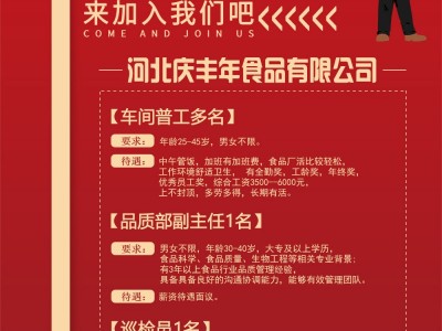 河北庆丰年食品有限公司招聘品质部副主任1名,男女不限,年龄30-40岁,要求大专及以上学历,食品科学、食品质量、生物工程等相关专业背景;有3年以上食品行业品质管理经验,具备具备良好的沟通协调能力,能够有效管理团队。薪资待遇面议!地址:鸡泽东营对面食品产业园区7号楼