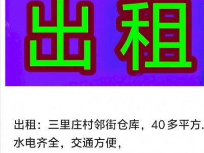 出租:三里庄村邻街仓库,40多平方,交通方便,水电齐全。