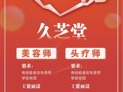 久芝堂招聘美容师、头疗师,有经验者优先录用,学徒也招,工资面议。