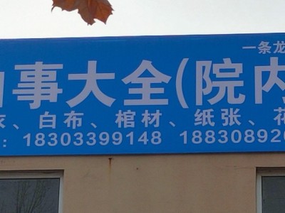 白事大全吴管营乡信用社西行50米路南院内!24小时服务,随叫随到!!!主营:棺材,寿衣,纸帐,灵车,灵棚,礼炮,花圈等有用到的电话联系。