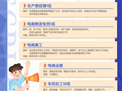 3、电商运营。要求懂得经营店铺,精通平台规则,有2年以上工作经验,薪资面议。
