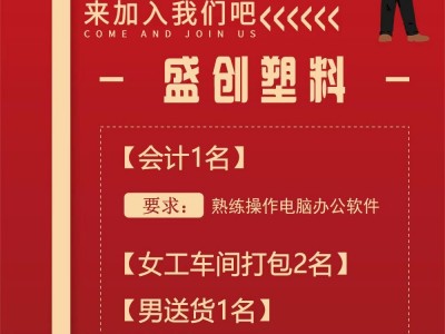 盛创塑料招聘 文员客服 1名,要求熟练使用办公软件。 女工车间打包 2人, 男工 配货员 年龄30岁以下 1人。