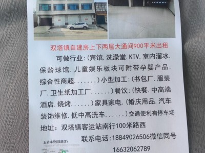 双塔镇自建房上下两层,大通间900平米出租,无行业限制,交通便利,有停车场,地址:双塔镇客运站南行100米路西(五谷丰登快餐店错对过) ,微信同号
