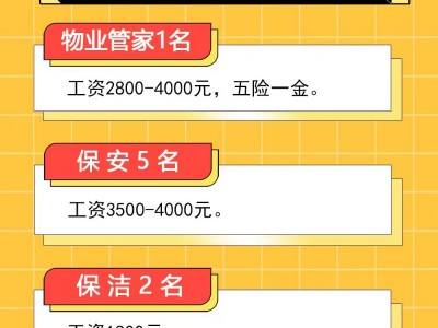 物业管家1人,工资2800-4000元,五险一金。