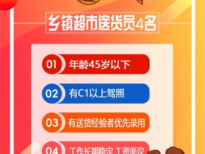乡镇超市送货员2人,女,年龄45岁以下,要求有C1以上驾照,有送货经验者优先录用,工作长期稳定,工资面议。