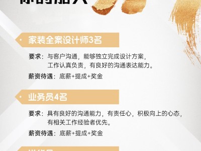 欧派健康整装招聘 1、家装全案设计师4名,职位要求:与客户沟通,能够独立完成设计方案,工作认真负责,有良好的沟通表达能力,月工资5000-10000元。 2、业务员4名,职位要求:具有良好的沟通能力,有责任心,积极向上的心态,有相关工作经验者优先,薪资待遇:底薪+提成+奖金。 3、送货员2名,职位要求:会骑三轮车,身体健康礼貌沟通,能吃苦耐劳,对装修材料认知优先,工资面议。 4、木工吊顶长期熟手工4名、腻子工2名,常年有活,工资有保障,工资面议。 地址:鸡泽滨河北小区东门向南60米路西
