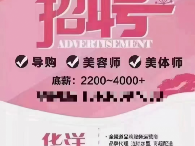 华洋美妆招聘美容师、销售店员,工资2500-6000元,要求:有上进心,爱岗敬业,地址:中长街尚品购物广场旁边